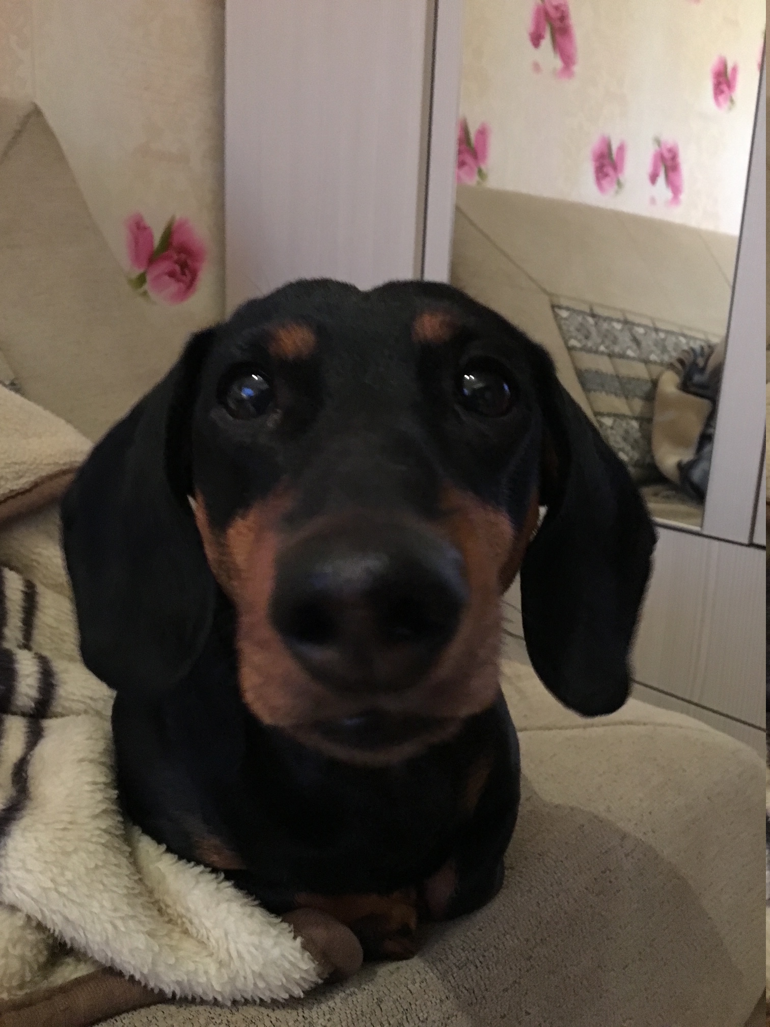 На фотографии моя собачка Боня.Такса 12 лет) Любит холодными и теплыми вечерами лежать под пледом) За 12 лет своей жизни никого не укусила:)